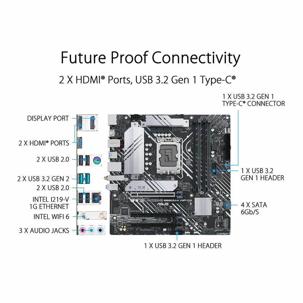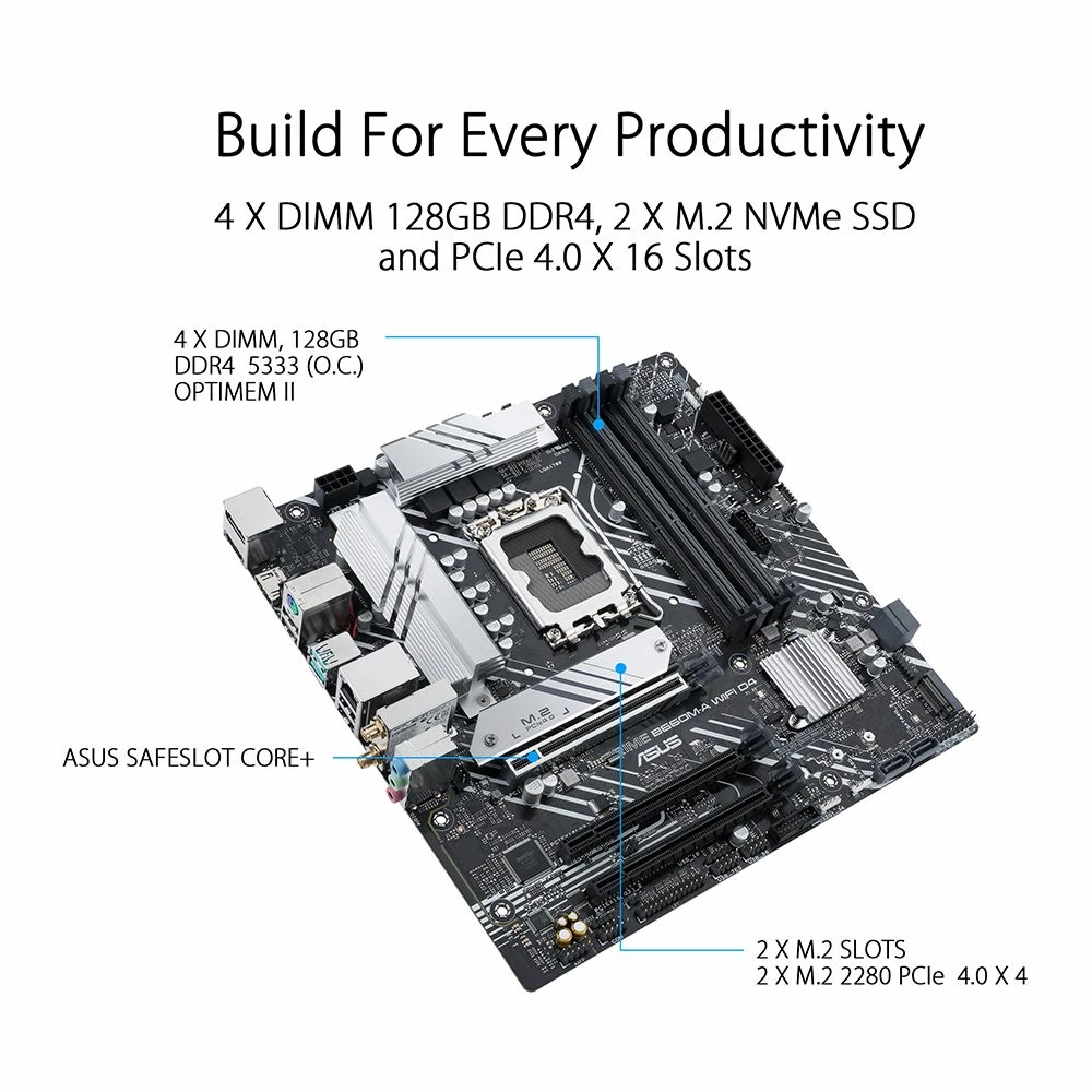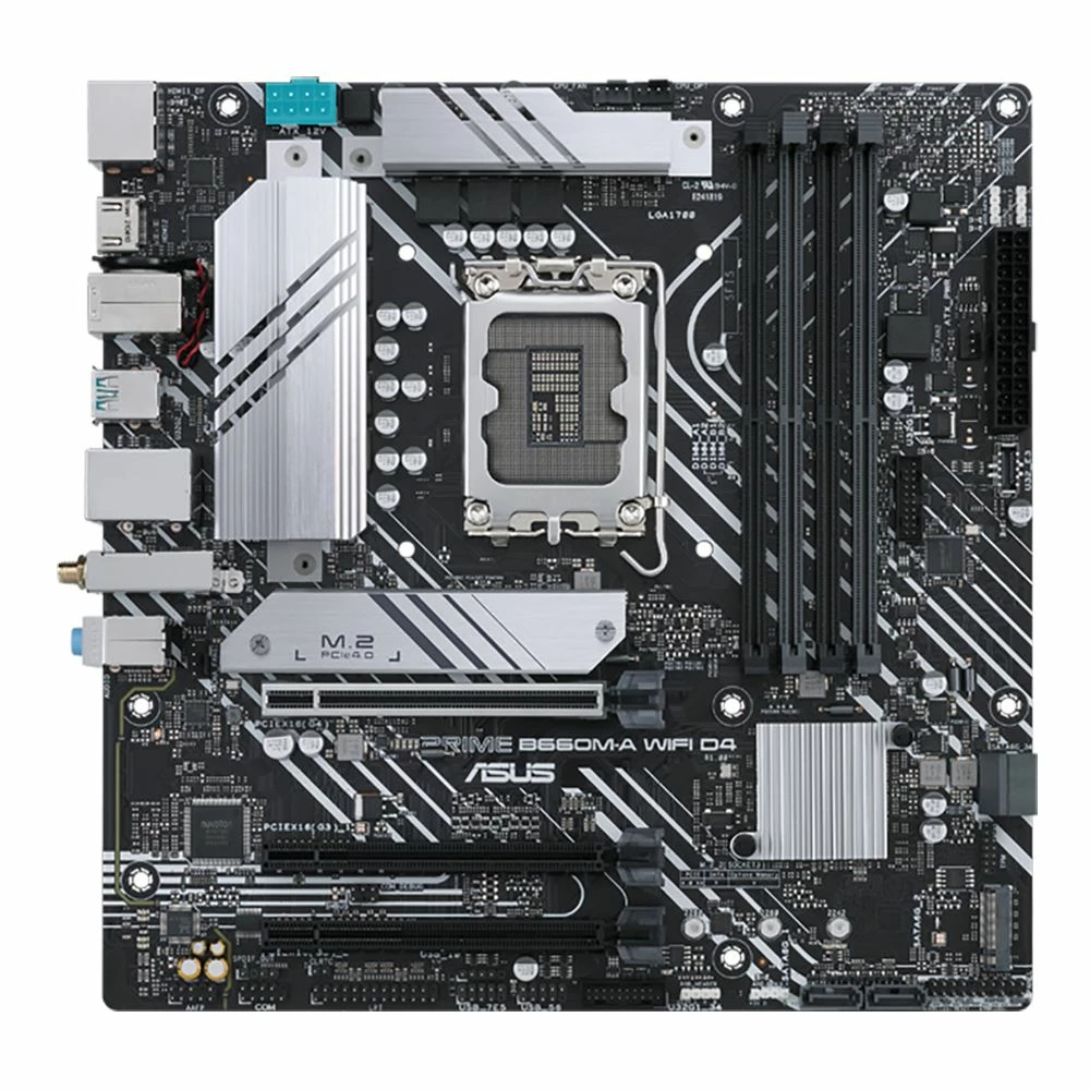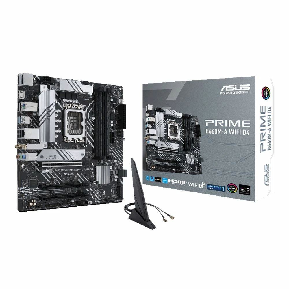 ASUS Prime series motherboards are expertly engineered to unleash the full potential of 12th Generation Intel processors. Boasting a robust power design, comprehensive cooling solutions and intelligent tuning options, Prime B660 provides users and PC DIY builders a range of performance tuning options via intuitive software and firmware features. ASUS PRIME B660M-A WIFI D4 offers a sleek, futuristic-looking build with a black and white finish, space-shuttle-inspired design elements, metallic nameplate and PCB cover.