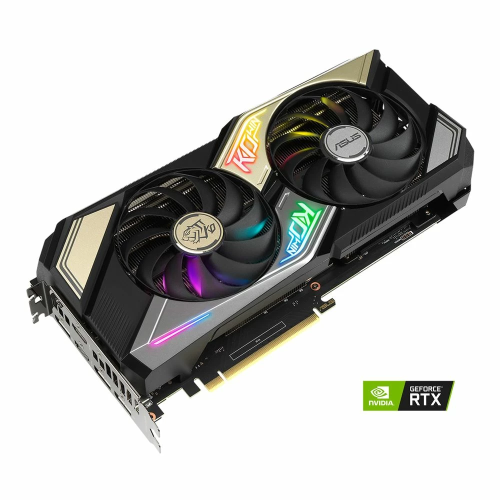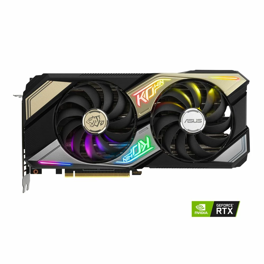 ASUS KO GeForce RTX 30 Series GPUs host the new NVIDIA Ampere architecture with some extra shine on performance and durability. Twin fans leverage our Axial-tech design for efficient cooling at low dB levels. Enhancements such as space-grade lubricant, Auto-Extreme Technology, and enduring capacitors keep KO composed for the most demanding scenarios. And a unique shroud takes on gold and silver faceplates with fully-customizable ARGB accents.
