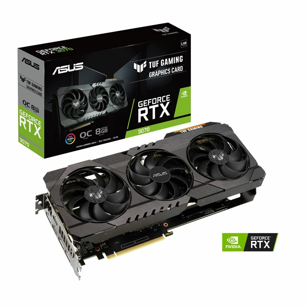 The TUF GAMING GeForce RTX 3070 has been stripped down and built back up to provide more robust power and cooling. A new all-metal shroud houses three powerful axial-tech fans that utilize durable dual ball fan bearings. Fan rotation has been optimized for reduced turbulence, and a stop mode brings all three fans to a halt at low temps. Beneath, a thick heatsink keeps thermals under tight control. Additional features, including TUF components, Auto-Extreme Technology, and a backplate vent make the TUF a proper powerhouse. For builders looking for a new old faithful, this card has your back.
