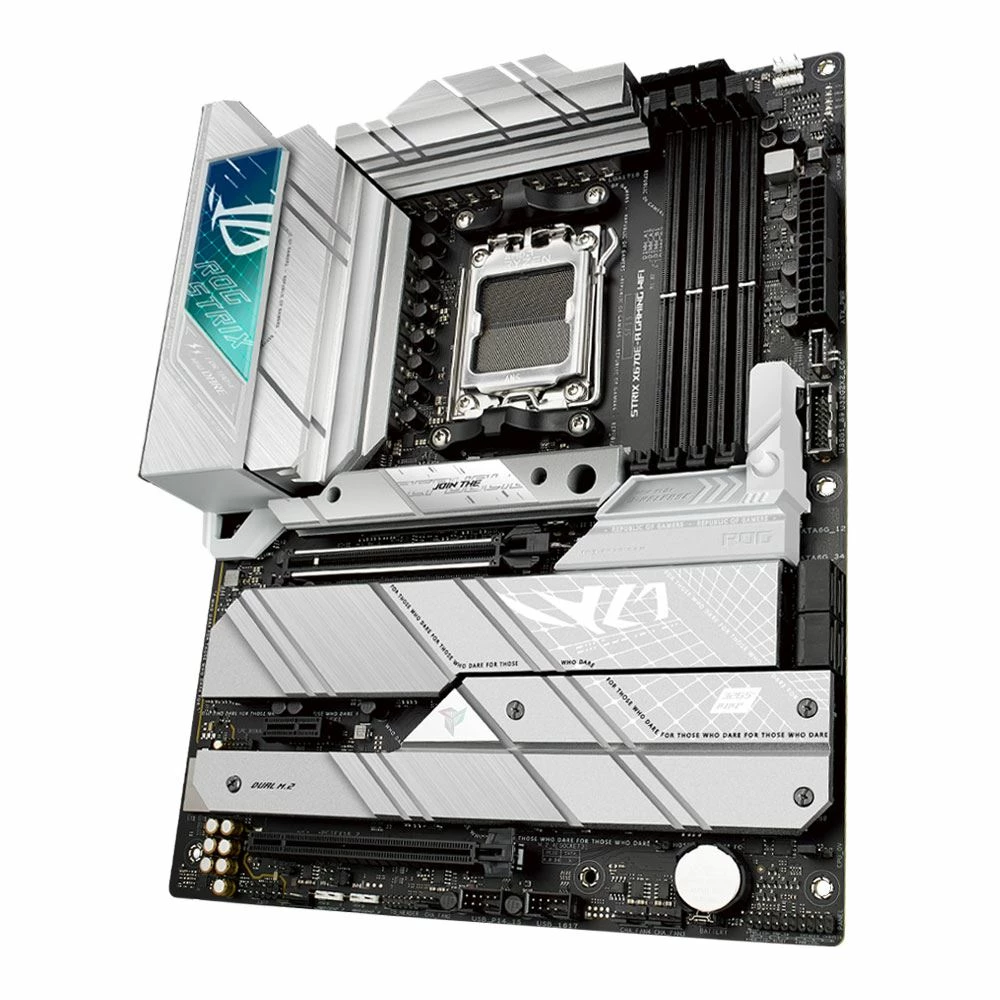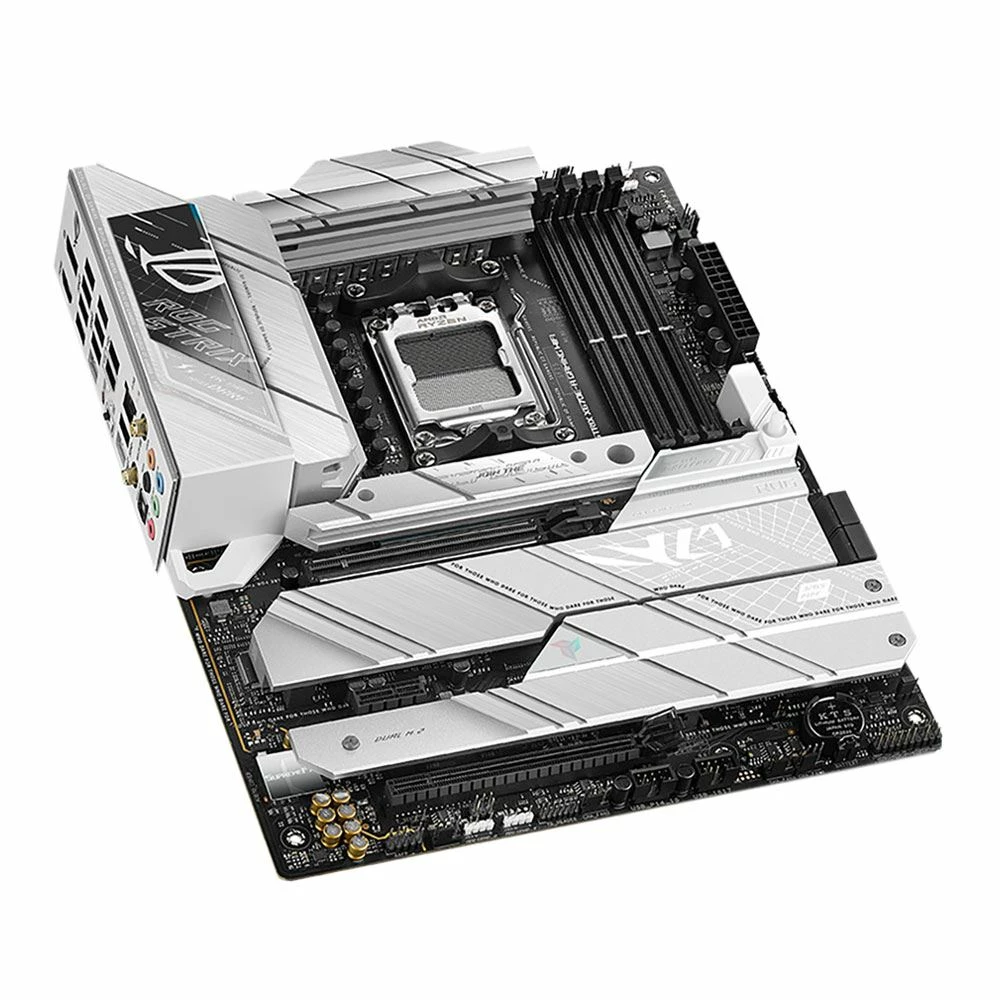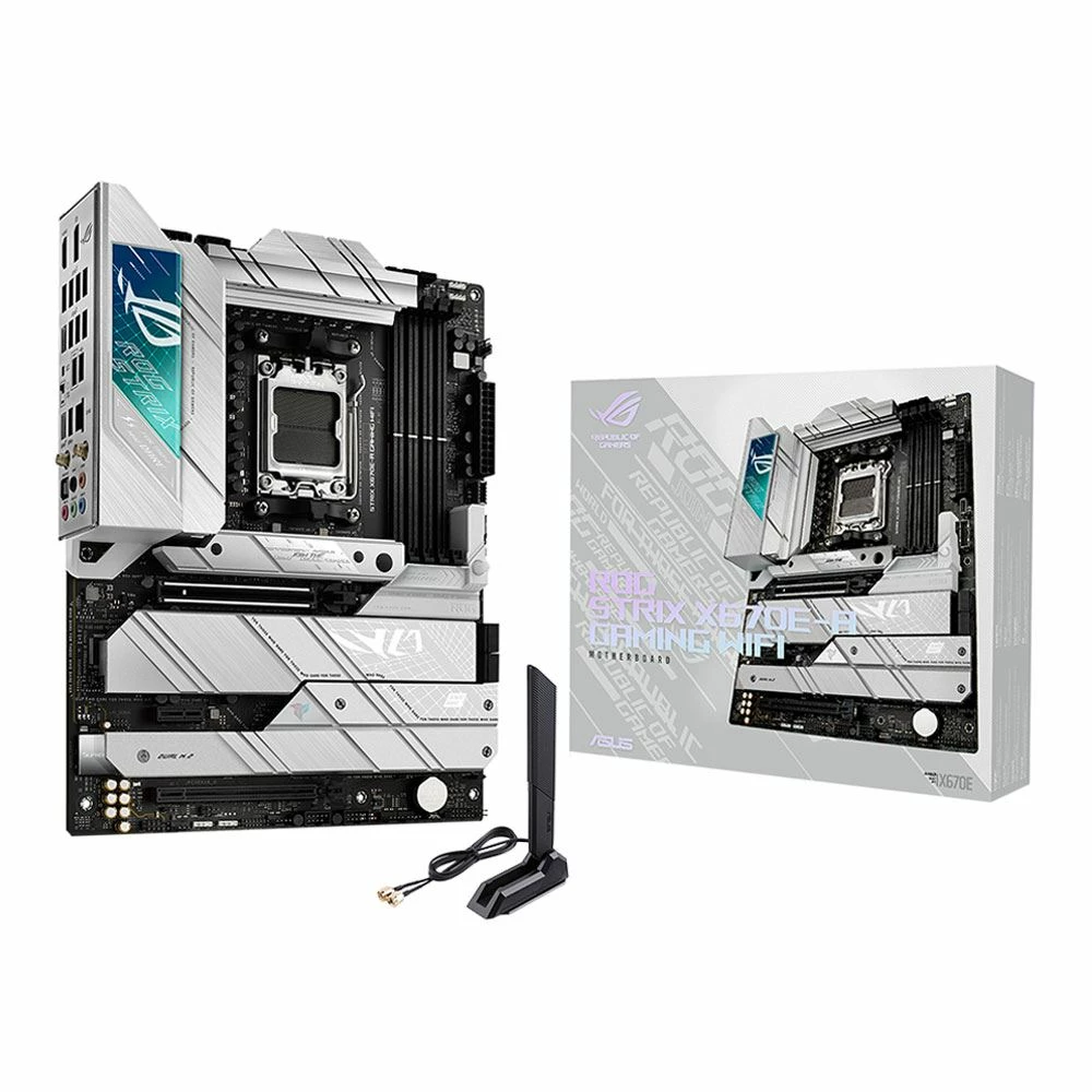 Suit up for the next gen with the stylish ROG Strix X670E-A Gaming WiFi. Its black PCB and white accents neatly contrast silver-colored heatsinks that emphasize premium power delivery for AMD Ryzen 7000 Series processors. Exclusive ROG overclocking utilities, full PCIe 5.0 capabilities, and DDR5 support are woven in alongside, adding uniquely tailored performance and AM5 essentials to your gaming build.
