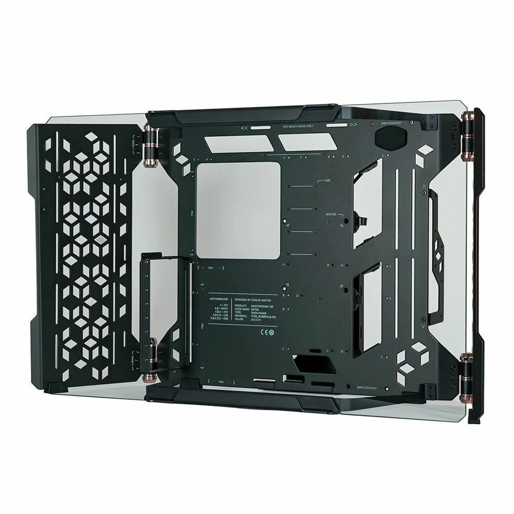 The MasterFrame 700 is a highly customizable open-air frame that can convert between a showcase PC chassis or a highly flexible test bench. MasterFrame 700 features a 3-part design consisting of two side wings and a fully featured motherboard tray. Four specially-designed friction hinges hold the side wings to the motherboard tray, allowing both full range of motion during assembly and stability when built, perfect for custom water-cooling loops.