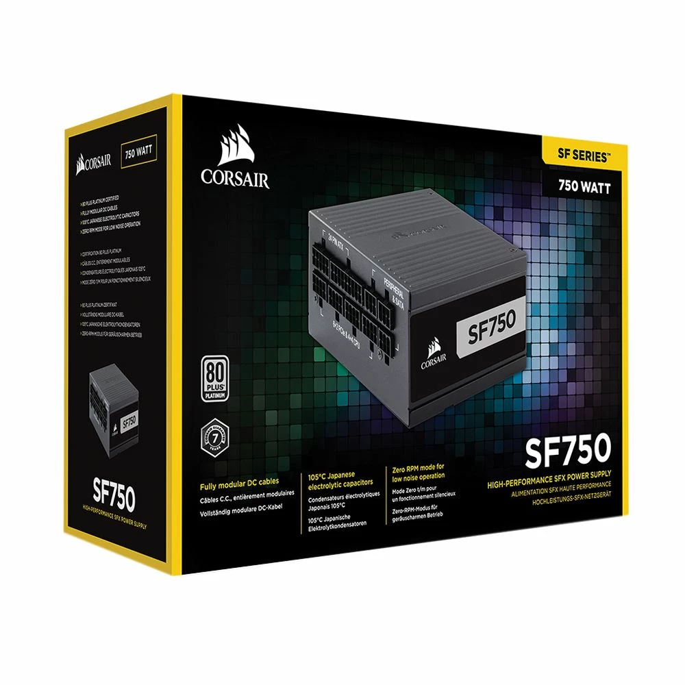 The CORSAIR SF750 80 PLUS Platinum SFX Power Supply is an extraordinarily power-dense PSU, ready to power the most cutting-edge small form factor PCs with 750 continuous watts. 80 PLUS Platinum certification makes it an ultra-efficient power supply, creating less heat and lower electric bills. A large 92mm fan provides industry-leading performance with minimal noise thanks to a Zero RPM mode that only activates at higher loads. Fully modular, individually-sleeved cables allow you to maximize space and improve airflow inside your PC. 105C rated Japanese capacitors and premium electrical components ensure superior performance for years of stable and dependable operation. Choose the SF750 for unprecedented power in your next small form factor PC.