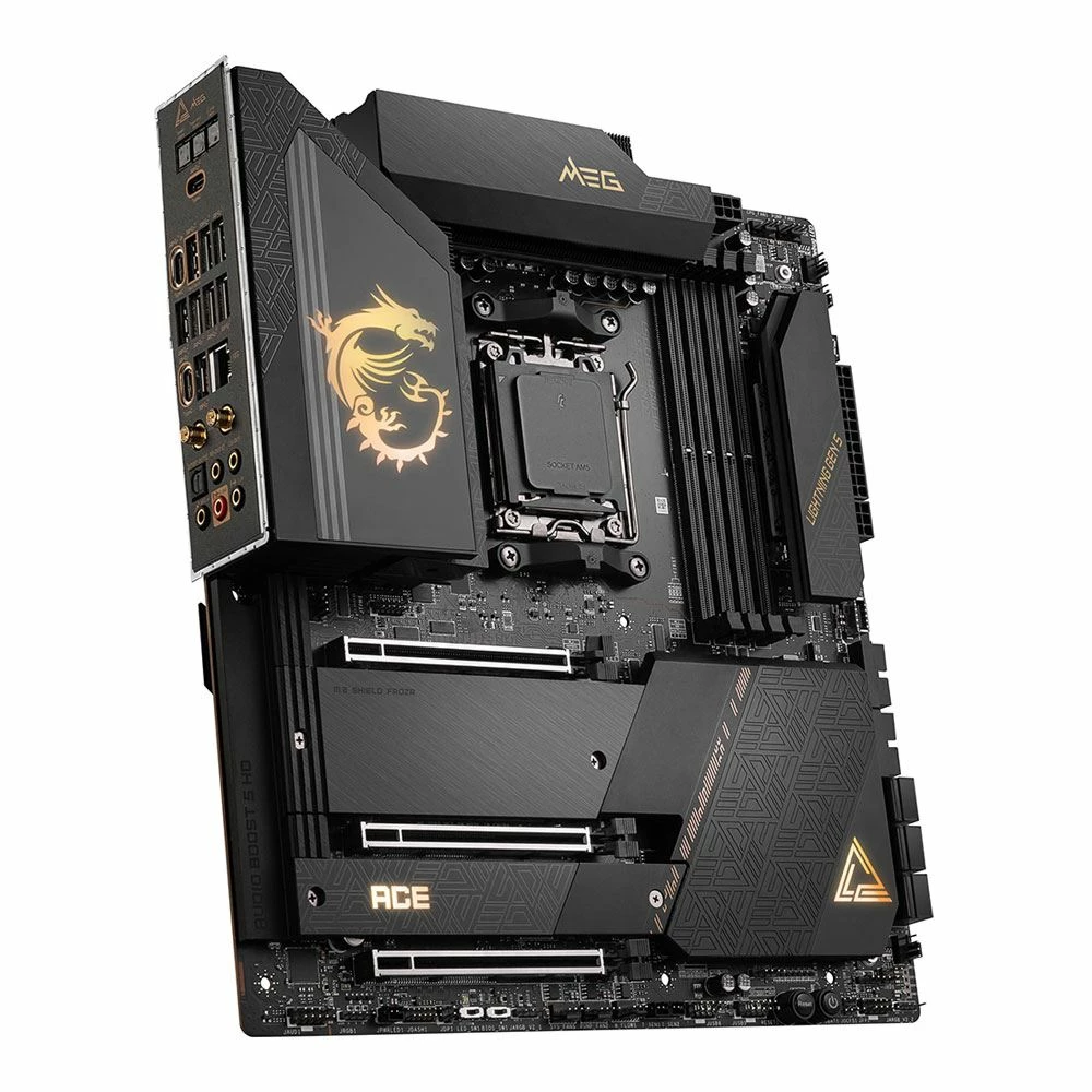 The MEG X670E ACE furnished premium aesthetics with its dark black finish and gold embellishes. Developed to unlock the full gaming potential of the AMD X670 chipset by combining elite hardware system support and premium durability, the MEG X670E ACE is an outstanding E-ATX platform for extreme settings in terms of overclocking memory, processor, and graphic card at the highest level.
